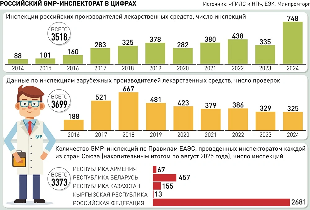 С 2021 года по текущий 2025 год на соответствие Правилам GMP ЕАЭС проведено более 2800 инспекций как российских, так и иностранных производителей лекарственных средств.